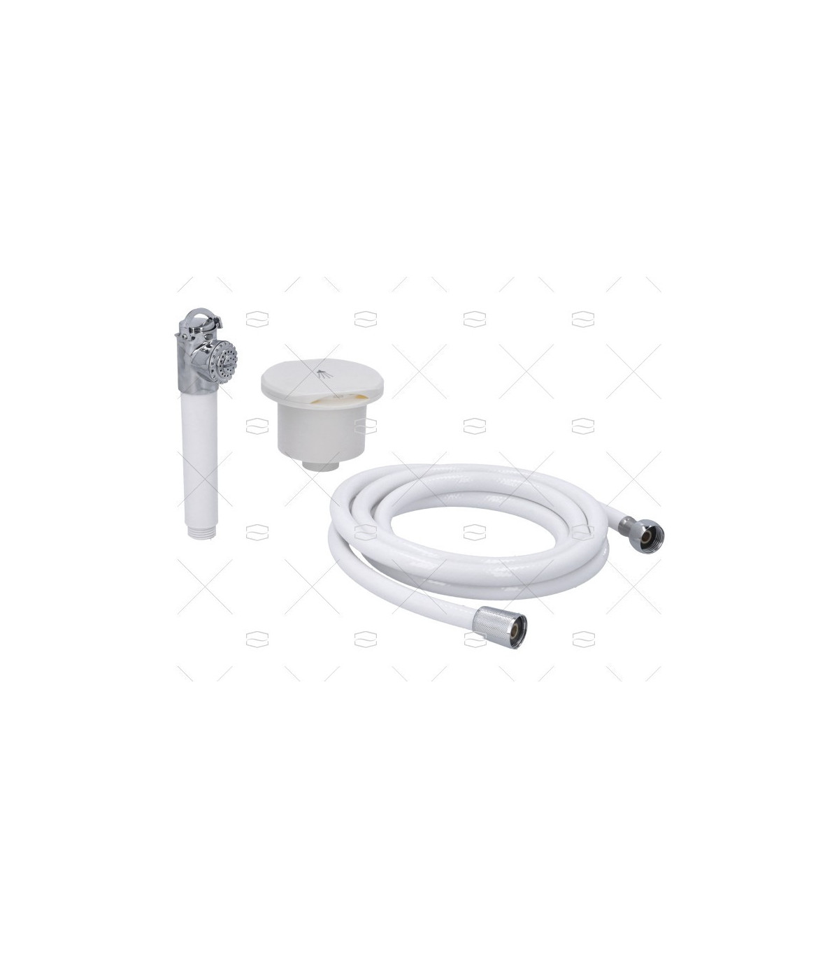 Caja de ducha redonda en color blanco, con ducha blanca, difusor plateado con tubo blanco en PVC de 2,5 mts de largo. Permite la curvatura del tubo en la salida de la caja (montaje Wall)