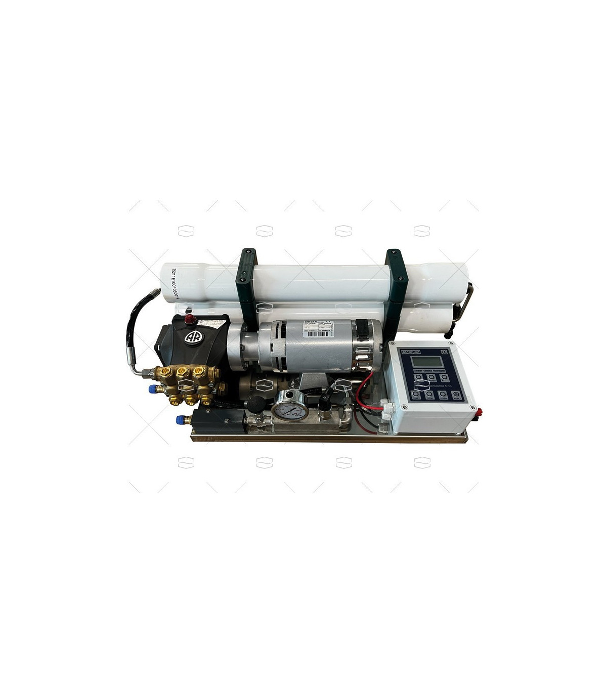 Desalinizadora compacta, alimentación a12 o 24V. Ideal para embarcaciones que no disponen de generador, bomba de alta presión con pistón de cerámica, presión de ejercicio 55bar 25ºC, con sistema de flujo automático.